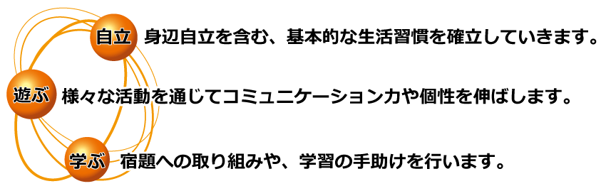 「自立」「遊ぶ」「学ぶ」から、言葉の発達、生活能力やコミュニケーション能力の向上を目指していきます。